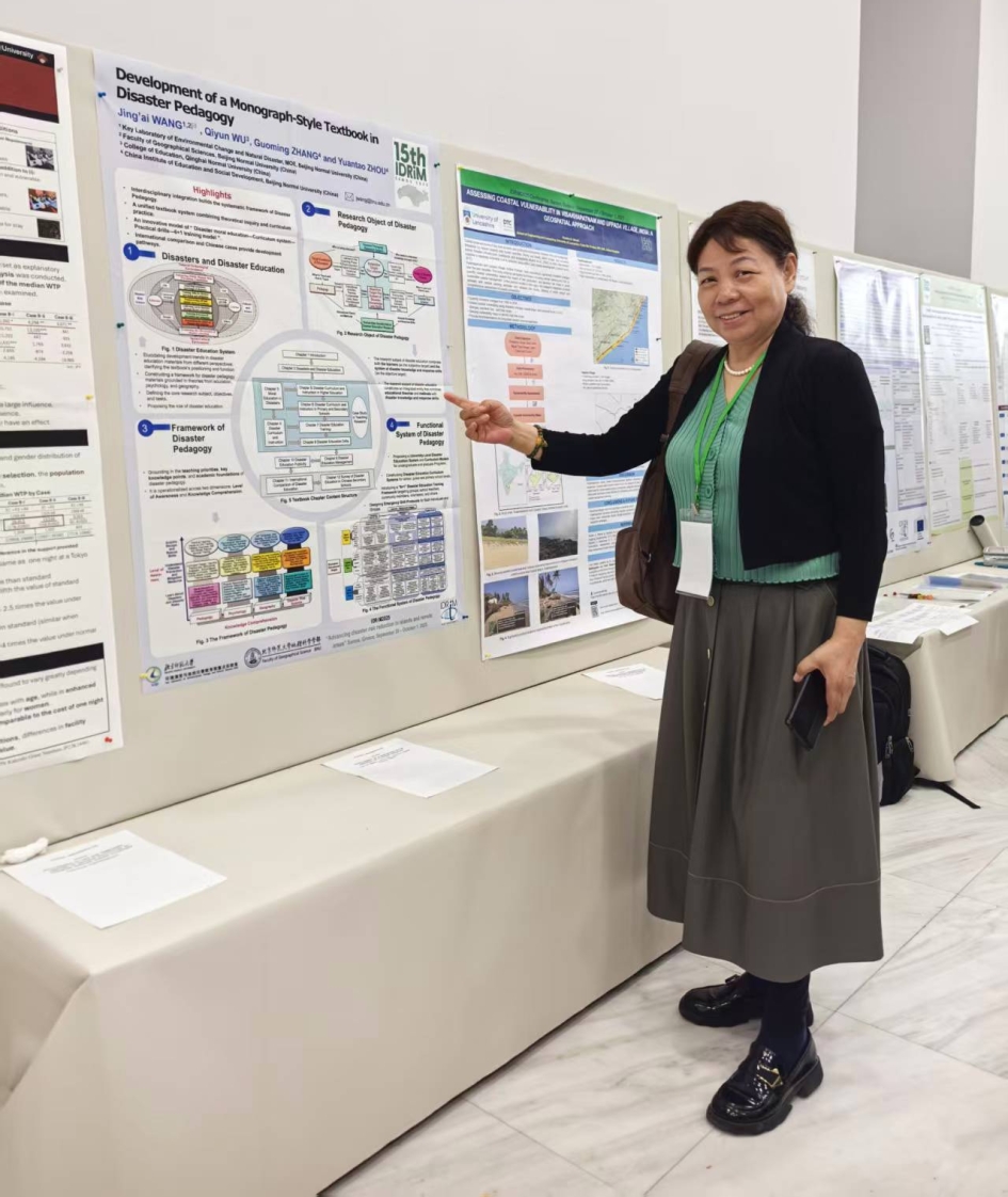 王静爱教授进行了题为“Development of a Monograph-Style Textbook in Disaster Pedagogy”的海报展示。该研究系统构建了灾害教育学的理论框架与课程体系,创新性编写了首部面向研究生层次的灾害风险教育专著教材,提出了灾害教育的核心功能与实施路径,建立了涵盖学校教育、专业群体培训与多主体参与的完整课程与管理体系,对推进我国灾害风险防范教育、提升公众防灾减灾意识与能力具有重要的现实意义。