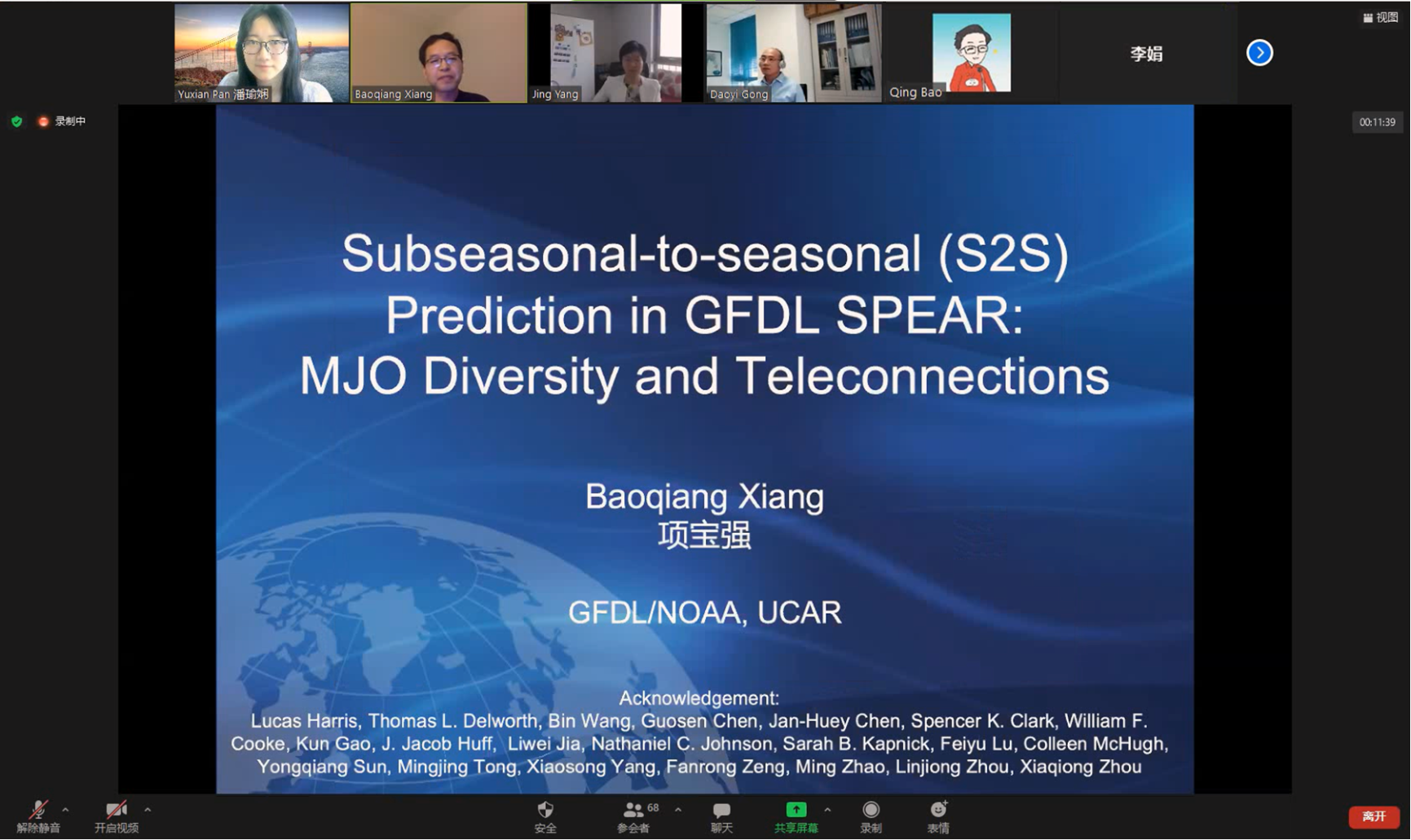 2021610日,地表过程与资源生态国家重点实验室地学前缘讲座通过线上会议平台成功举办本次讲座邀请到了美国普林斯顿大学地球物理流体动力实验室(GFDL/NOAA, UCAR)项宝强研究员,报告题目为“S2S Prediction in GFDL SPEAR: MJO Diversity and Teleconnections”。此次讲座由杨静教授主持,海内外近70位师生参与此次讲座。