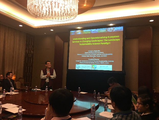 邬建国教授、黄庆旭副教授和马群博士分别在“Guidelines and Toolkits for Ecosystem Services Assessment、“Urban Ecosystem Services and Sustainable Urban Development和“Spatial Explicit Assessment and Valuation of Ecosystem Services分会场作了学术报告。报告题目依次为“Understanding and Operationalizing Ecosystem Services in Changing Landscapes: The Landscape Sustainability Science Paradigm、“Projecting the Impacts of Urban Expansion on the Losses of Ecosystem Services和“Impacts of Surface Coal Mining on the Environment of the Mongolian Plateau