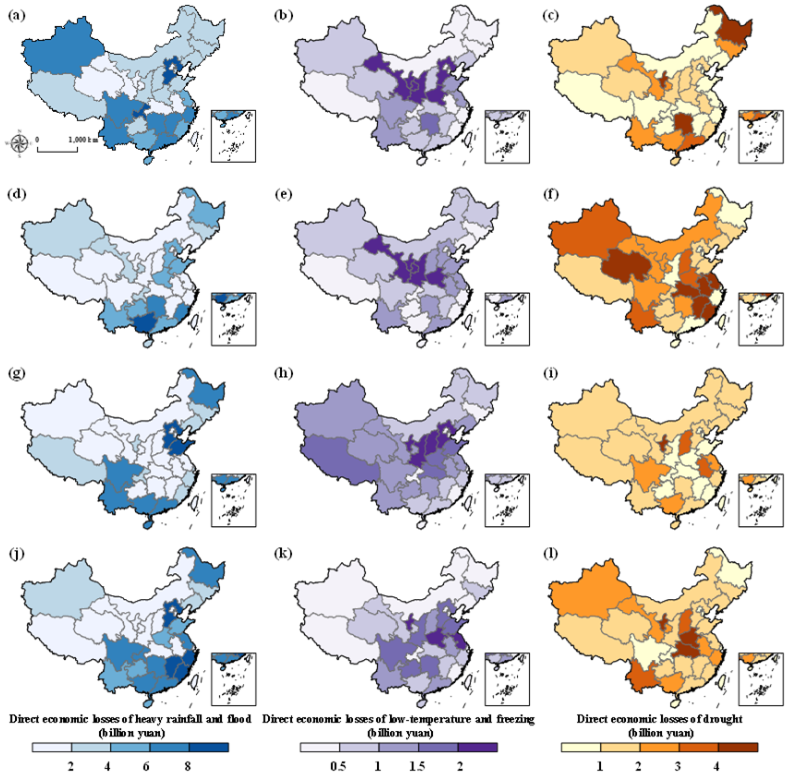 图2 我国三类气象灾害直接经济损失预测结果的空间分布(2021-2024)。a、d、g、j为暴雨洪涝灾害,b、e、h、k为低温冷冻灾害,c、f、i、l为干旱灾害。