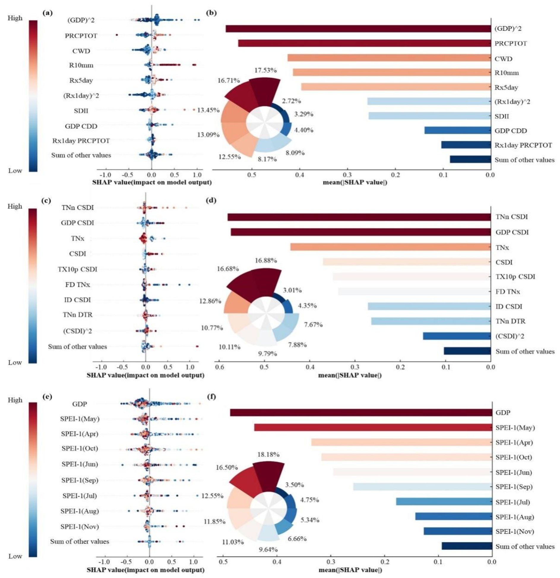 图1 我国三类气象灾害在LightGBM算法中的SHAP分析结果。a、b为暴雨洪涝灾害,c、d为低温冷冻灾害,e、f为干旱灾害。